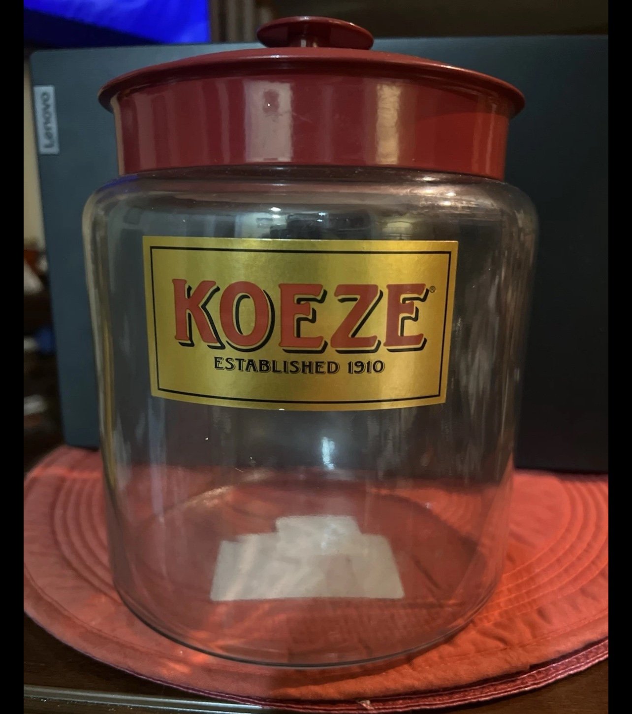 You are purchasing a Vintage Koeze Glass Canister, Large round , Kitchen Storage, Glass Snack Jar, originally held cashew nuts,. Great piece of history and decor.